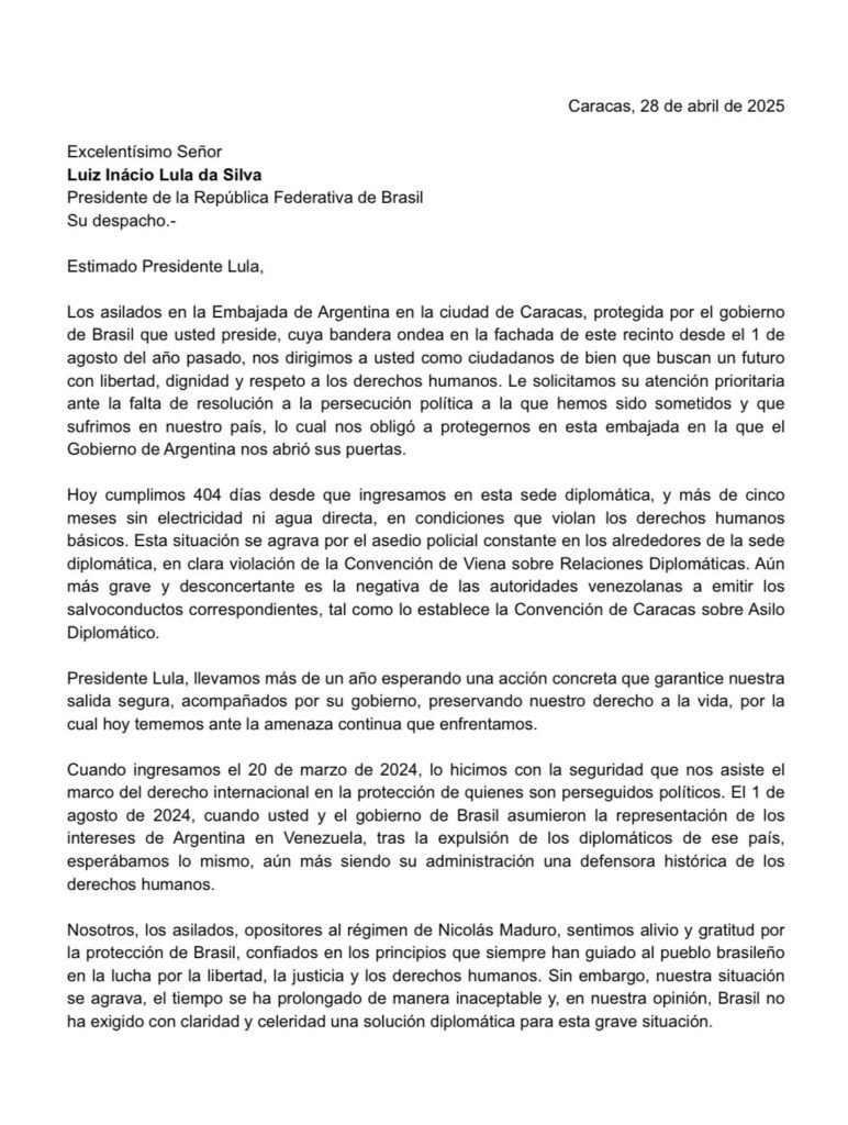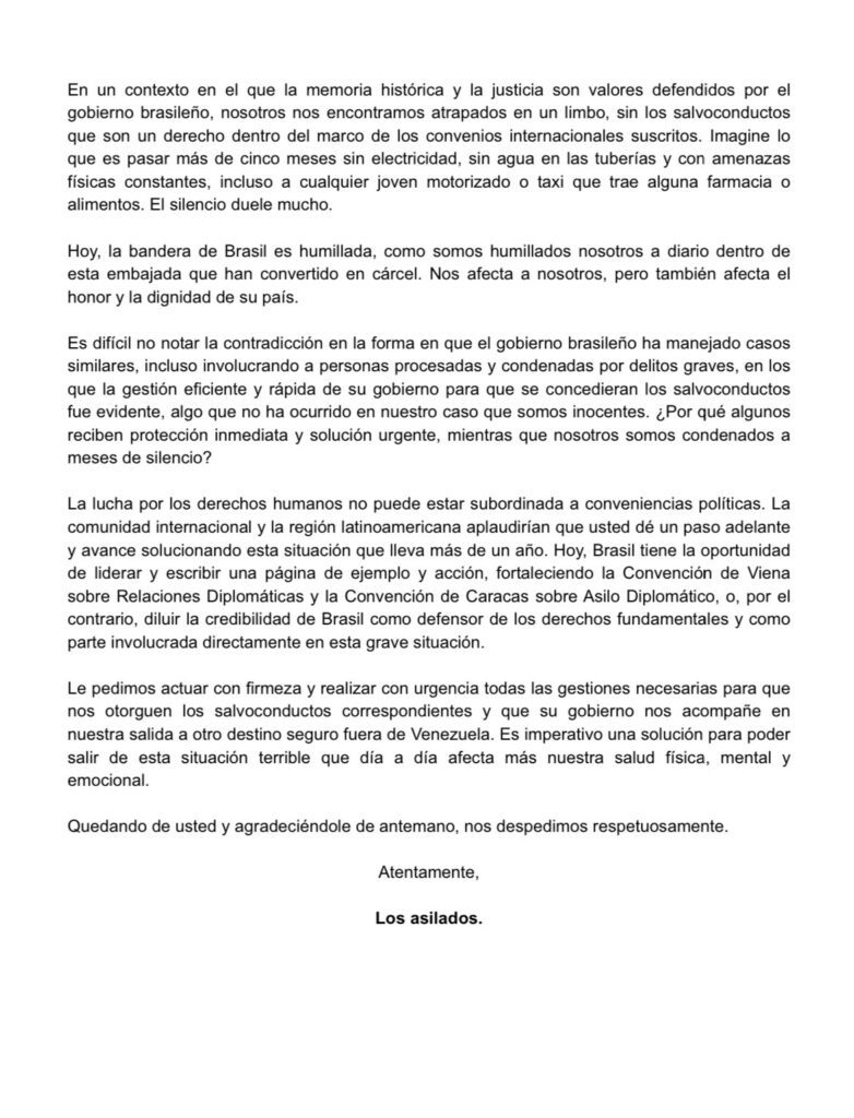 Los asilados en la Embajada de Argentina en la dudad de Caracas, protegida por el gobierno de Brasil que usted preside, cuya bandera ondea en la fachada de este recinto desde el de agosto del año pasado, nos dirigimos a usted como ciudadanos de bien que buscan un futuro con libertad, dignidad y respeto a los derechos humanos. Le solicitamos su atención prioritaria ante la falta de resolución a la persecución política a la que hemos sido sometidos y que sufrimos en nuestro país. lo cual nos obligó a protegernos en esta embajada en la que el Gobierno de Argentina nos abrió sus puertas.