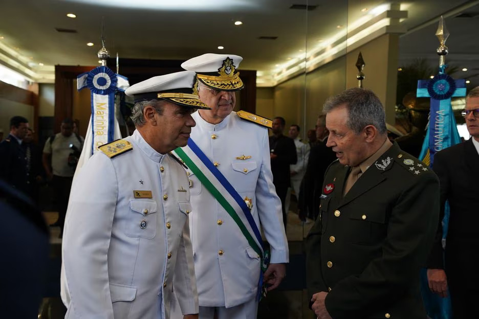 O almirante Marcos Olsen (esq.), comandante da Marinha, em companhia do almirante Renato Rodrigues de Aguiar Freire, chefe do Estado-Maior Conjunto das Forças Armadas (centro) e do general Tomás Miguel Ribeiro Paiva (dir.), comandante do Exército, durante a entrega da medalha do Mérito da Defesa, em 2023 Foto: MARINHA DO BRASIL