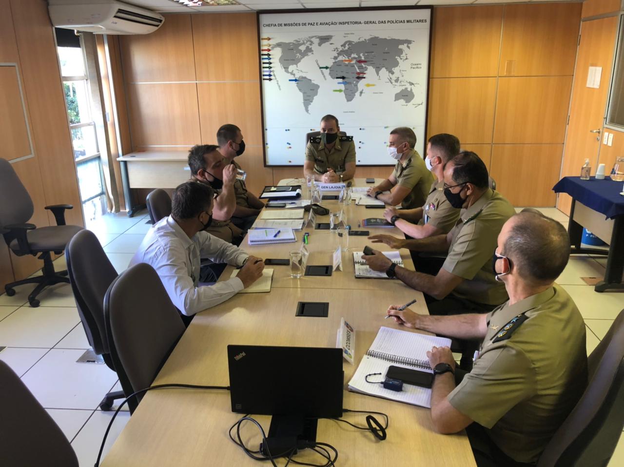 Participaram da reunião o Chefe de Missões de Paz e Aviação/IGPM, General de Brigada Flávio dos Santos Lajoia Garcia, e representantes da Assessoria 1 do Gabinete do Comandante do Exército, do Centro de Comunicação Social do Exército e do Estado-Maior do Exército, além de integrantes da Divisão de Missão de Paz do COTER.
