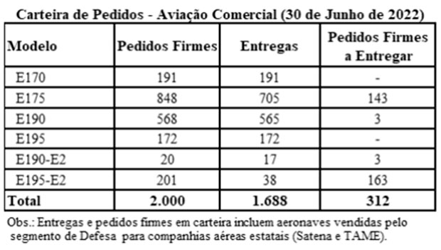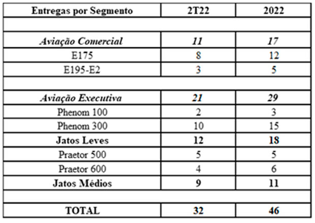A Embraer entregou 32 jatos no segundo trimestre de 2022, sendo 11 comerciais e 21 executivos (12 leves e 9 médios). No ano, a empresa acumula um total de 46 aeronave entregues (17 comerciais e 29 executivas). A carteira de pedidos firmes (backlog) encerrou o 2T22 em US$ 17,8 bilhões, o maior nível desde 2T18, impulsionada por novas vendas de aeronaves e serviços, um crescimento de 12% quando comparado aos US$ 15,9 bilhões registrados no mesmo período de 2021.