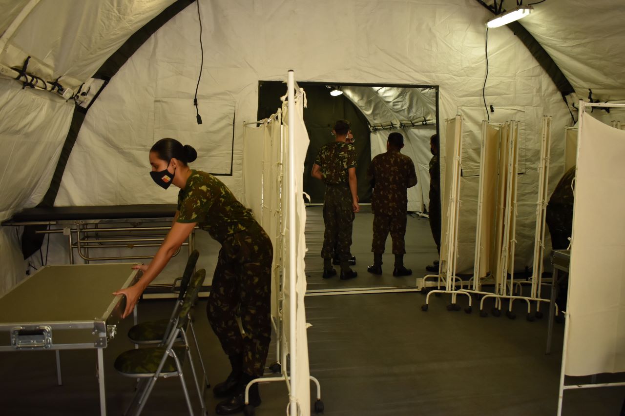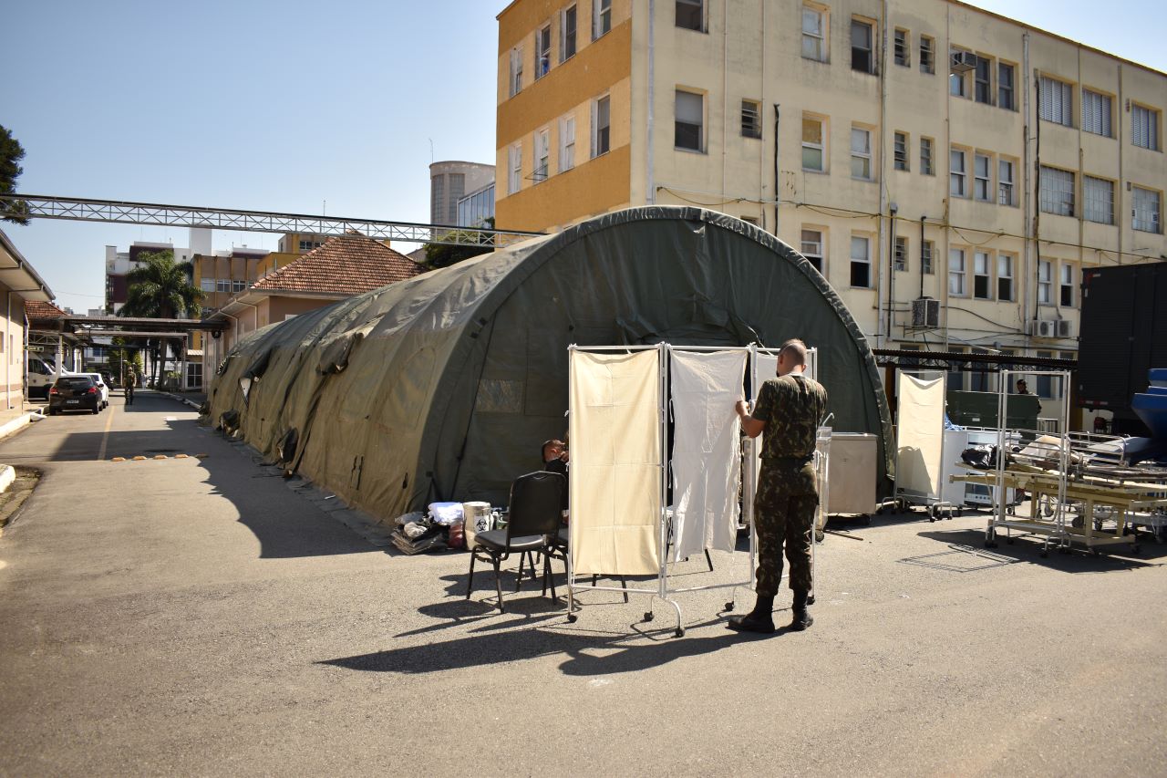 No início desta semana, o Exército Brasileiro montou um módulo reduzido do Hospital de Campanha do Rio de Janeiro (H Cmp) no pátio do Hospital Geral de Curitiba (HGeC). A estrutura foi enviada à capital paranaense para aumentar a capacidade de atendimento do HGeC, que cuida da saúde da família militar no Paraná e em Santa Catarina, e foi instalada em menos de 48 horas.