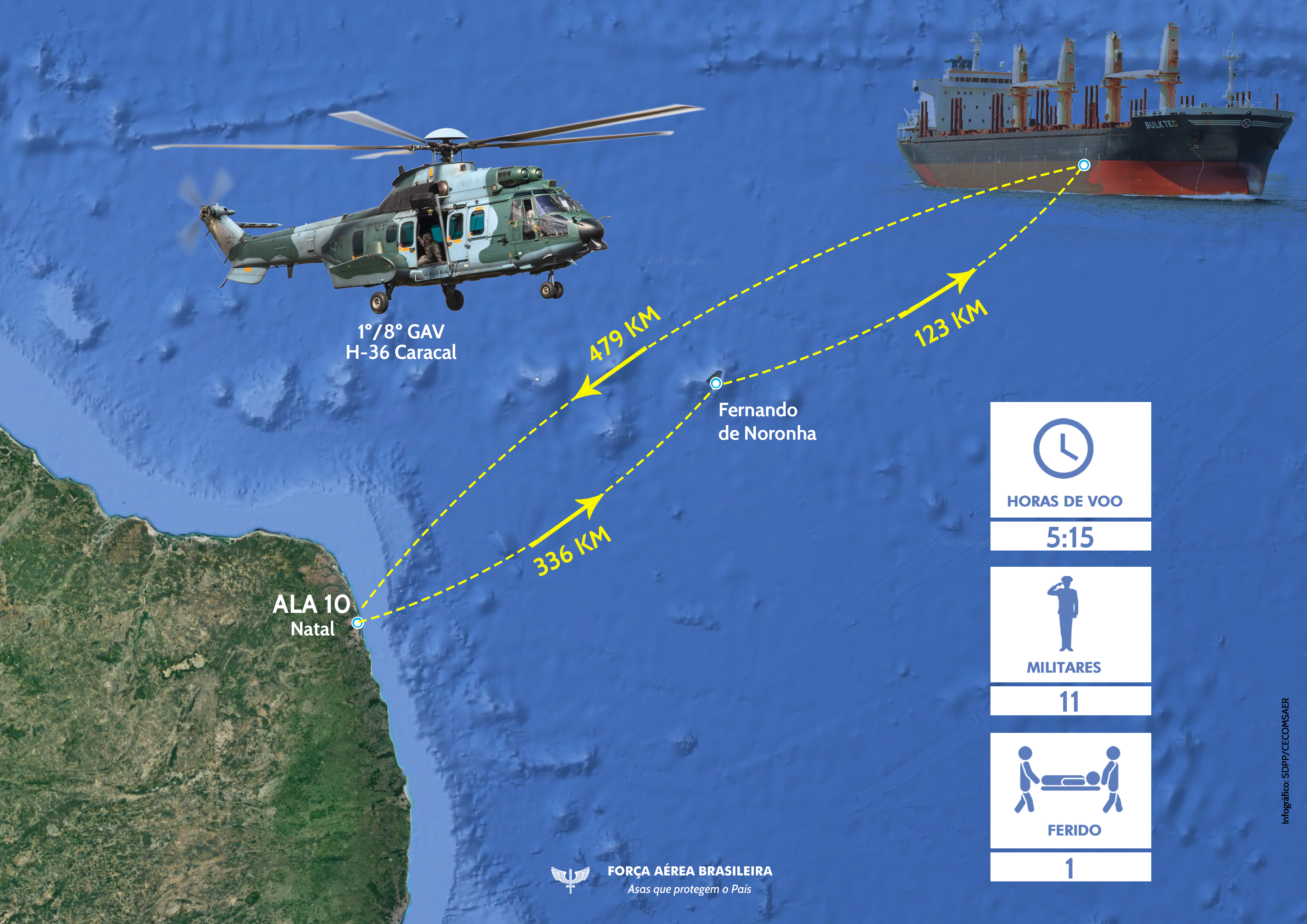 Antes da decolagem do helicóptero, militares do Esquadrão de Saúde de Natal analisaram as informações recebidas pelo Centro de Coordenação de Busca e Salvamento Marítimo (SALVAMAR) sobre o estado da vítima, que apresentava fratura exposta na perna esquerda. O navio, oriundo de Malta, foi localizado a cerca de 470km da costa brasileira, na direção da cidade de Natal (RN).