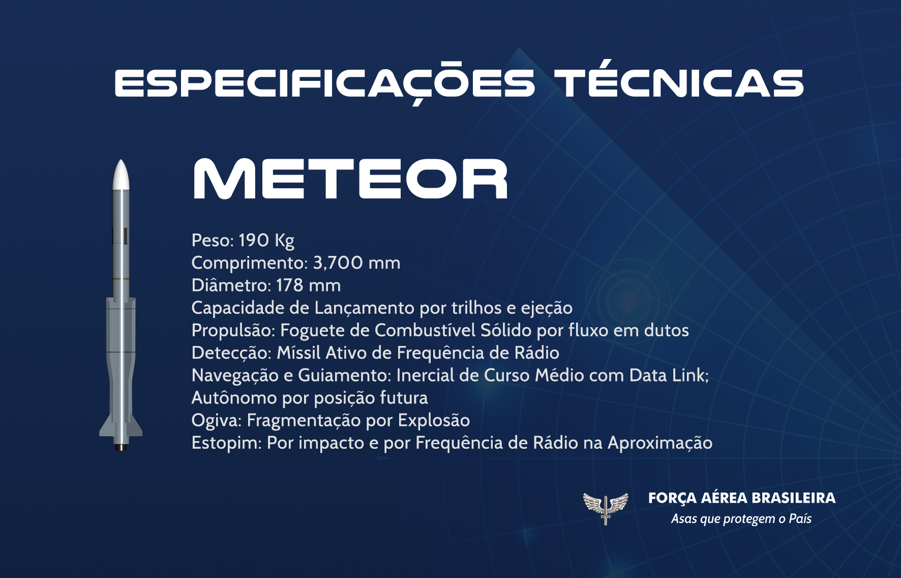 A Força Aérea Brasileira (FAB) recebeu o segundo lote do míssil Meteor, que vai equipar as aeronaves de caça F-39 Gripen, cujas primeiras quatro unidades foram entregues pela SAAB, no dia 24 de novembro. O primeiro lote havia sido comprado para o desenvolvimento da aeronave. Com o novo armamento, o Brasil dará um salto na capacidade de combate aéreo, cumprindo, assim, o objetivo de ser uma Força Aérea de grande poder dissuasório, operacionalmente moderna e atuando de forma integrada para a defesa dos interesses nacionais.