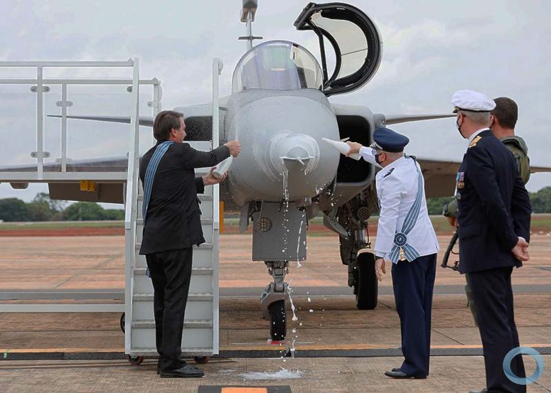 Presidente Bolsonaro e Brigadeiro Bermudez batizam a primeira unidade do Caça Gripen F-39E recebido pelo Brasil. Outubro 2020.