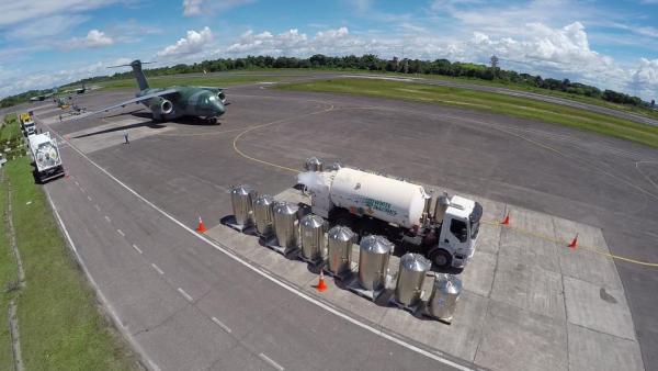 Outra missão, foi de um KC-390 Millennium, que carregou em Brasília oito tanques de oxigênio, pesando 12.785 quilos de carga, com destino à Manaus.