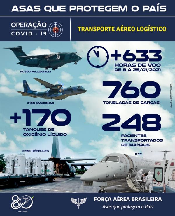 As missões nas aeronaves da Força Aérea Brasileira (FAB) para salvar vidas no estado do Amazonas alcançaram 633 horas de voo. Desde o início da operação até domingo (24/01), a FAB transportou tanques de oxigênio líquido, cilindros de oxigênio e equipamentos, totalizando 760 toneladas.