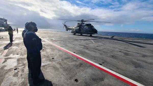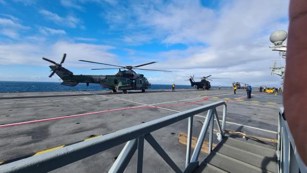 Pela primeira vez na história das Forças Armadas, helicópteros Exército Brasileiro (EB) e da Força Aérea Brasileira (FAB), em conjunto com a Marinha do Brasil (MB), realizam exercícios no Navio Aeródromo Multipropósito Atlântico, com a embarcação em movimento.