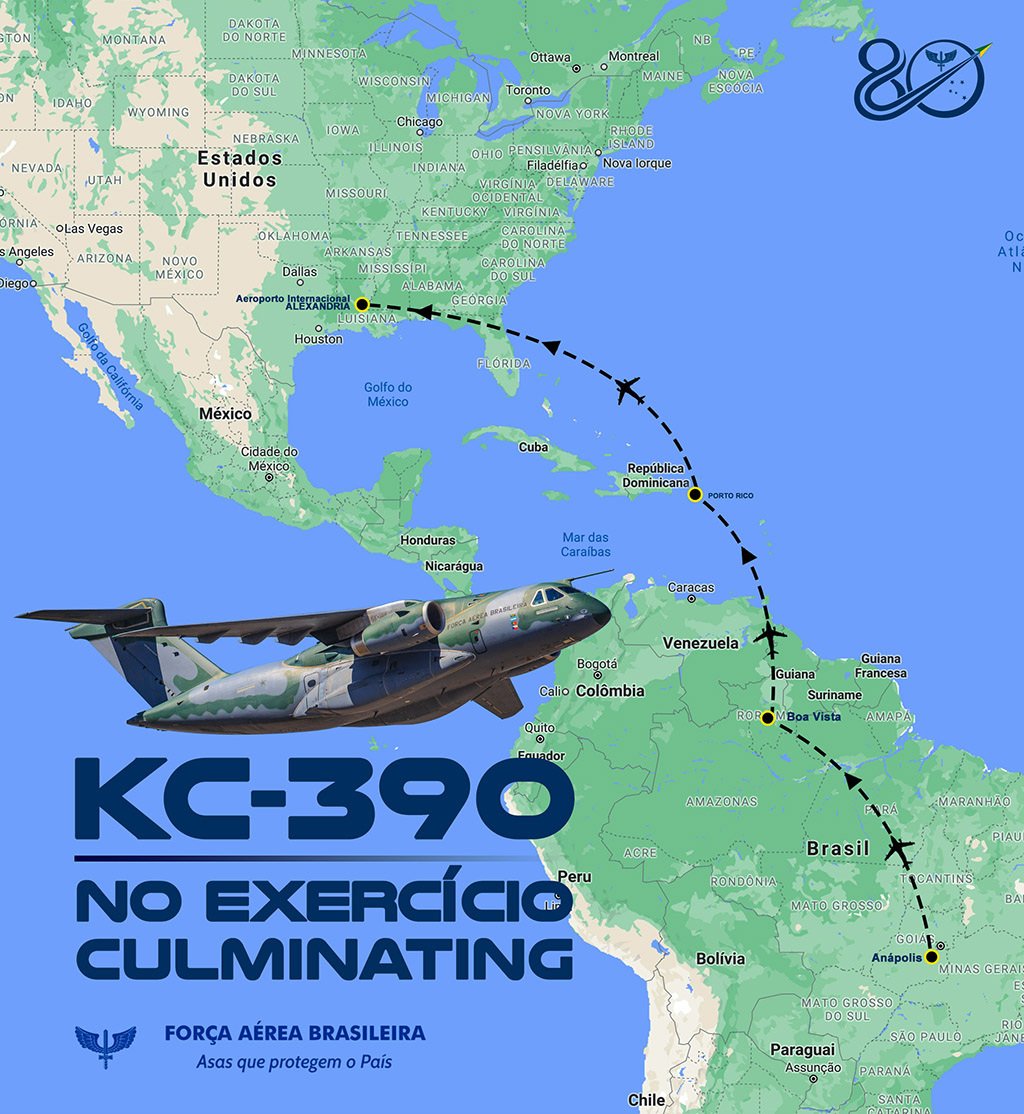 A primeira parada da aeronave foi em Boa Vista (RR) e, na sequência, o KC-390 realizou pouso técnico em Porto Rico, de onde seguiu para o Aeroporto de Alexandria, em Louisiana. De lá os militares se deslocam para Fort Polk, uma unidade do exército norte-americano, que será a base dos participantes.