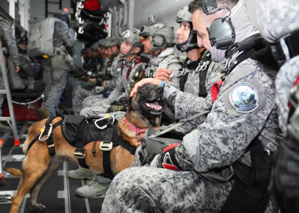 A aeronave Multimissão da Força Aérea Brasileira (FAB), o KC-390 Millennium, realizou nessa terça-feira (31) o lançamento de paraquedistas da Força Aérea Colombiana (FAC). A bordo do avião, 13 militares e dois cães treinados para atuarem em cenários de guerra foram lançados pelas portas laterais da aeronave, em salto livre. O voo foi realizado na região de Palanquero, na Colômbia, no módulo FAM-FIT, sigla para Familiarization Flight (FAM) e Forces Integration Training (FIT).