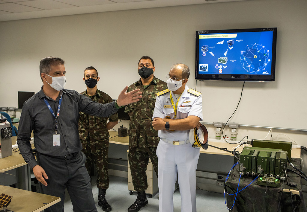 Engenheiro da AEL Sistemas apresenta o projeto RDS-Defesa para o Chefe de Operações Conjuntas do Ministério da Defesa, Almirante-de-Esquadra Petronio Aguiar. Oficiais do Centro Tecnológico do Exército participam do desenvolvimento do rádio definido por software
