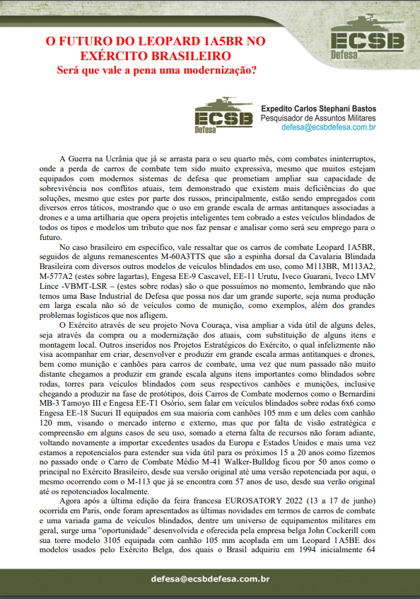 Agora após a última edição da feira francesa EUROSATORY 2022 (13 a 17 de junho) ocorrida em Paris, onde foram apresentados as últimas novidades em termos de carros de combate e uma variada gama de veículos blindados, dentre um universo de equipamentos militares em geral, surge uma “oportunidade” desenvolvida e oferecida pela empresa belga John Cockerill com  sua torre modelo 3105 equipada com canhão 105 mm acoplada em um Leopard 1A5BE dos modelos usados pelo Exército Belga, dos quais o Brasil adquiriu em 1994 inicialmente 64 unidades que mais tarde chegou a 128, empregados até 2009 e ali exibido para o público com a designação de Leopard Medium Tank 3105.