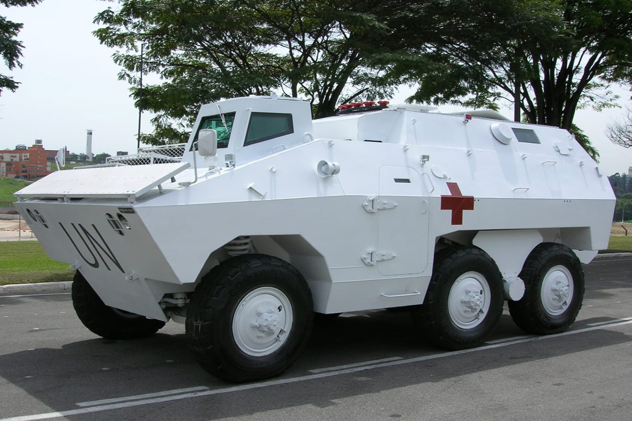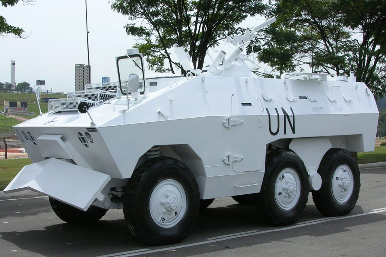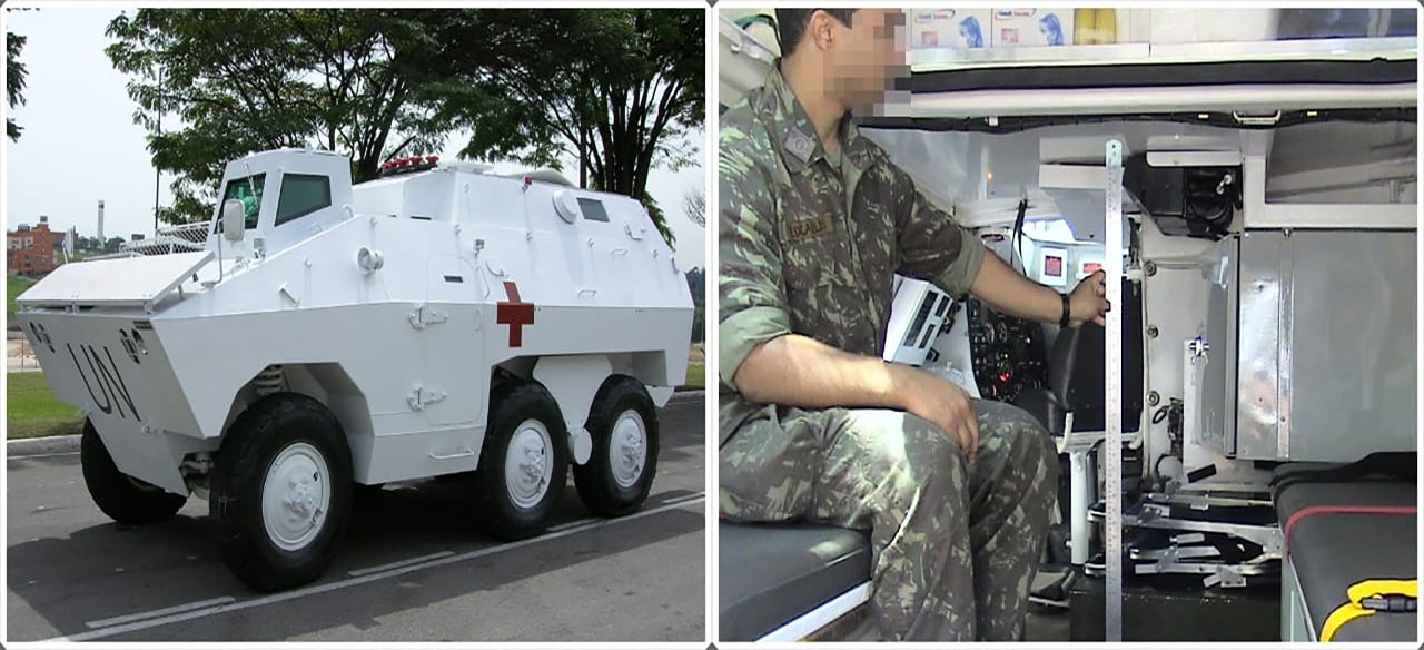 "O Arsenal de Guerra de São Paulo (AGSP) parabeniza os Peacekeepers!"; em 2004 o Brasil assumiu a MINUSTAH (Missão das Nações Unidas para a Estabilização no Haiti) e devido às condições encontradas no país caribenho, o Exército Brasileiro emprega meios blindados sobre rodas.
