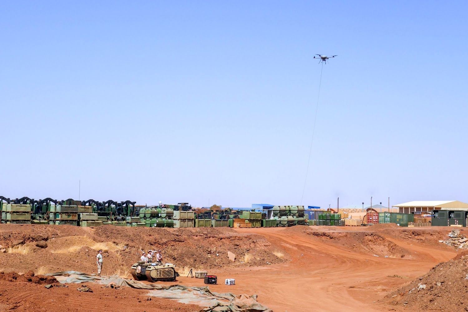 As câmeras montadas podem proteger os combatentes, mas não podem ver tão longe quanto as câmeras aéreas, enquanto os drones conectados fornecem vigilância FOB em uma ampla faixa óptica. Especialmente com uma impressionante capacidade de zoom óptico de 30 vezes, as câmeras podem detectar veículos e outros objetos grandes a 10 km de distância. Drones adicionalmente amarrados oferecem vigilância BVLOS, uma capacidade que falta nas câmeras estáticas. Conseqüentemente, quando o perigo é detectado, os soldados têm mais tempo para se preparar para qualquer ataque.