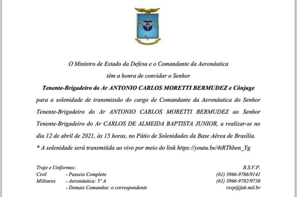 O Oficial-General substituirá o Tenente-Brigadeiro do Ar Antonio Carlos Moretti Bermudez, que está no cargo desde 2019. Assista a transmissão da Cerimônia Militar de Transmissão do Cargo de Comandante da Aeronáutica ao vivo, a partir das 15h, pelo canal oficial da FAB no Youtube.