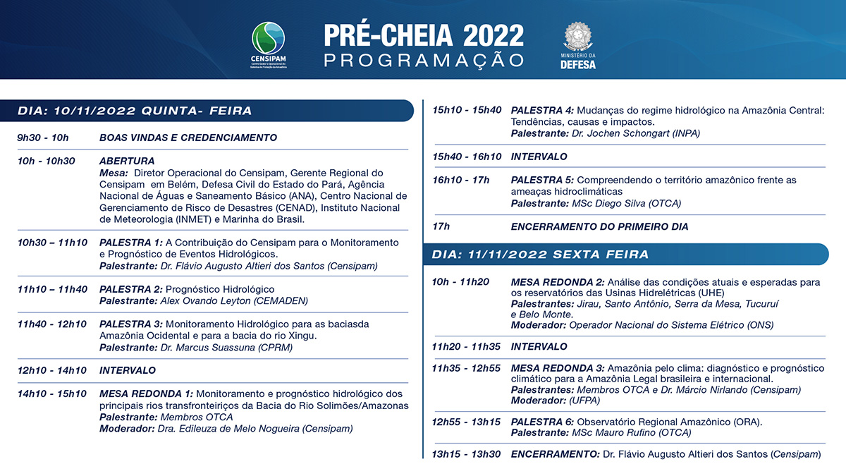 Brasília (DF), 09/11/2022 – O Ministério da Defesa (MD), por meio do Centro Gestor e Operacional do Sistema de Proteção da Amazônia (Censipam), promoverá, nos dias 10 e 11 de novembro, em Belém (PA), o evento "Pré-Cheia 2022 – Análise e Prognóstico para 2023".