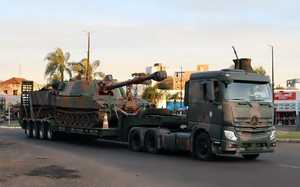 Plataforma do Exército Brasileiro transportando um obuseiro AP M-109A3BR e um M113. Transporte destes equipamentos posicionados no extremos Sul até Roraisma leve de 3 a 4 semanas via rodoviária e fluvial Foto CMS